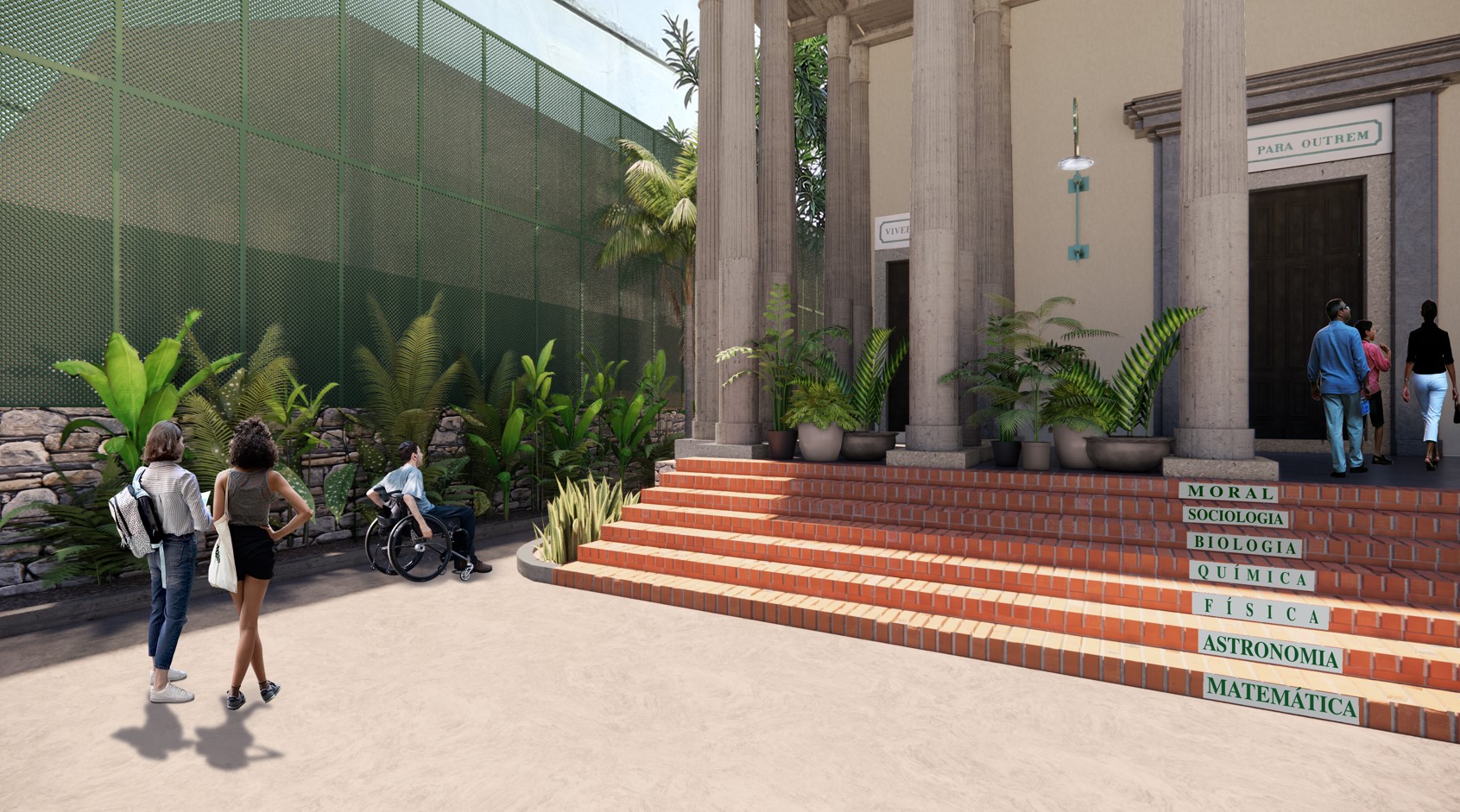 - Escadaria de acesso ao templo, com destaques aos campos de conhecimento da corrente filosófica